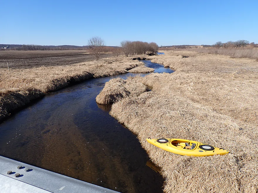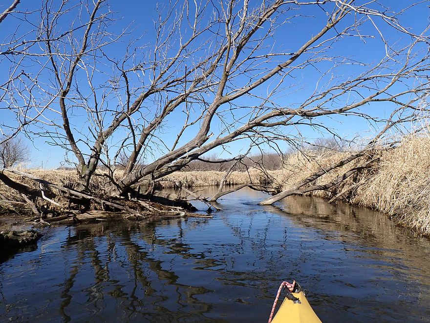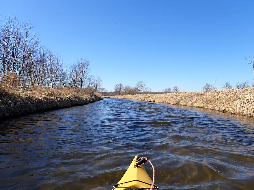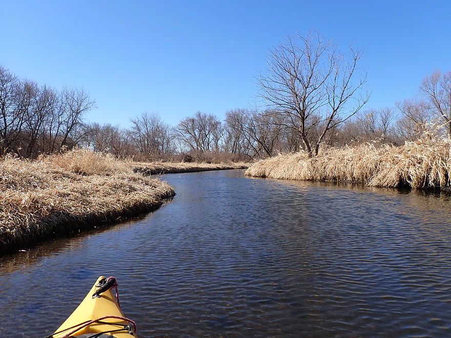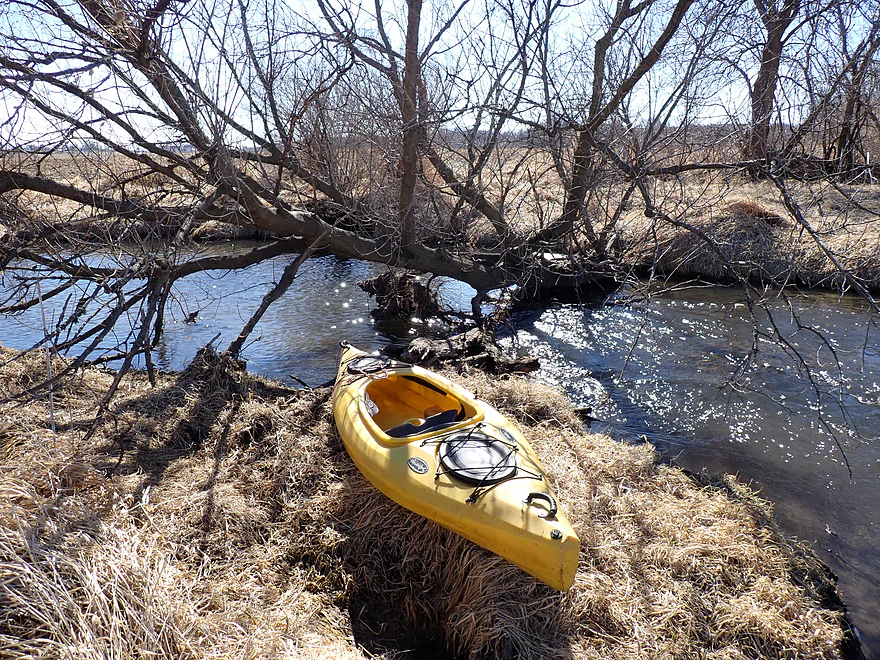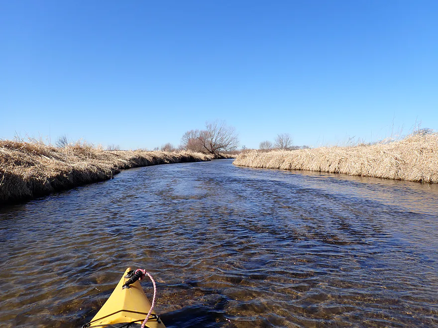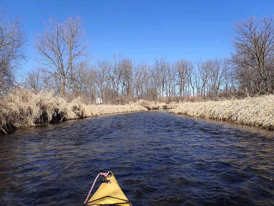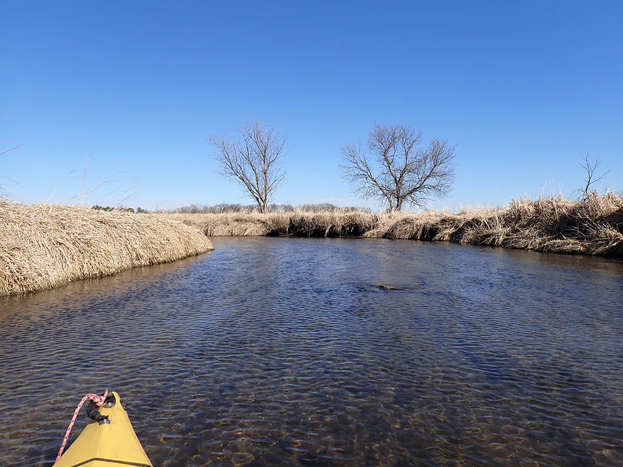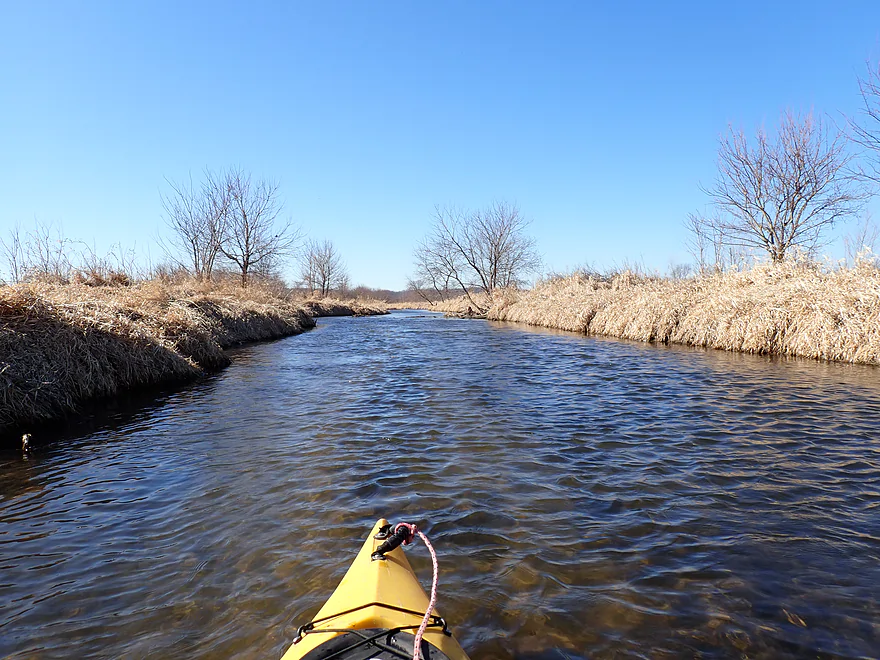 The first mile of the trip cut through the Evansville Wildlife Area, which featured an expansive wet-grass marsh. The creek here flowed suspiciously straight–a sure sign that early farmers had ditched it to expand their fields.