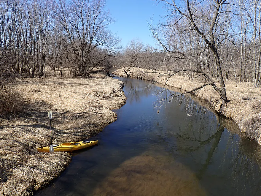 - Lake Leota Park to Hwy 59/213: 4.0 miles. First half of the trip flows through a densely canopied forest with some logjam issues. Second half of the trip flows through the Evansville Wildlife Area which is open, grassy, and monotonous. A highlight of the trip are the canals in Lake Leota Park.