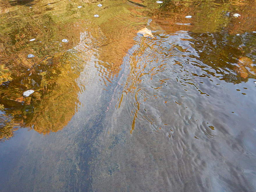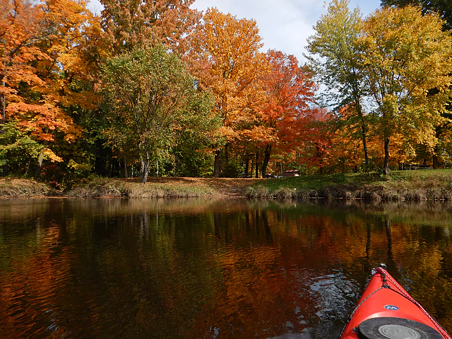 What made this trip extra special was the timing: it was terrific for fall color! Not only on the banks…but the fallen leaves (especially the many maple leaves) created very attractive patterns on the water surface. A log or obstruction would block the leaves to create very cool leaf dams. In some cases, the leaves had sunk in mass in clear water, creating a striking scene to paddle over.