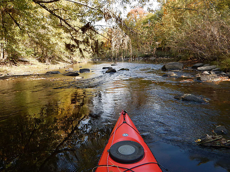 This was a pretty shallow trip, with most of the riffles being somewhat bumpy. I went at 34 CFS (measured by the local Stratford Gauge) and would not want to go much lower. I never once had to get out…but it would have been nice to glide over the riffles instead of bumping down them like stairs. On the flip side, you don’t want to go too high, or the attractive boulder gardens will be buried. And then even higher, the riffles could become dangerous rapids. My “guestimate” of a good depth range would be a floor of 40 CFS and a ceiling of 70 CFS. Possibly a ceiling of 100 CFS…and things could be pushy above that. I do believe this river flash floods (the gauge peaked at 8000 CFS a month ago), so do keep an eye on levels. As far as rapids go, nothing was above class 1 at this low flow rate. Mostly riffles, with maybe one slightly pushy section that could be tougher in higher water.