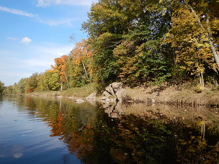 Some clams, dragonflies, an eagle and a deer. For all practical purposes this is an “up-north trip,” and yet there were very few pines and, instead, mostly hardwoods, which gives the river a unique character and made for a great fall color paddle. Not many open sections, with good dense tree cover giving the river a more intimate feel despite its decent width.