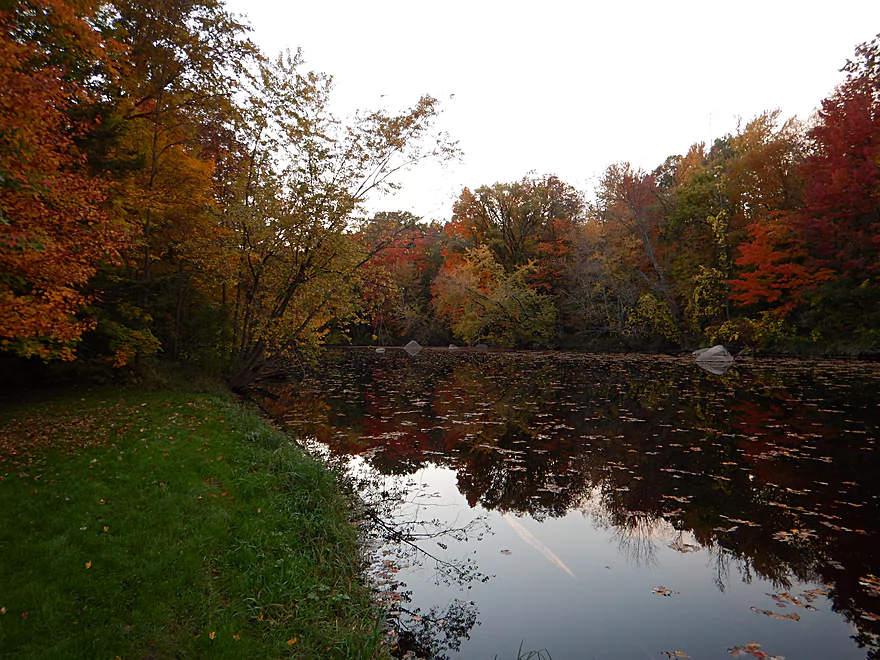 Nice public access is available at Big Rapids County Park, with facilities and picnic area. Here there is a small dam and small flowage and you’ll have the choice of putting in above or below the dam. If you put in above the dam, you’ll get to use a very nice launch area for canoes by the grass and you can paddle a bit upstream to check out “Big Rapids” (what I did). At 34 CFS, Big Rapids wasn’t very big, but instead was an attractive boulder garden that was very photogenic against the fall colors. I believe you could navigate Big Rapids in a smallish boat at 34 CFS if you chose your route well and were willing to accept a bunch of bumps and get out a few times. To get around the dam (from upstream) there is a portage path on the SW side that is pretty good. Maybe not so good during high water though.
