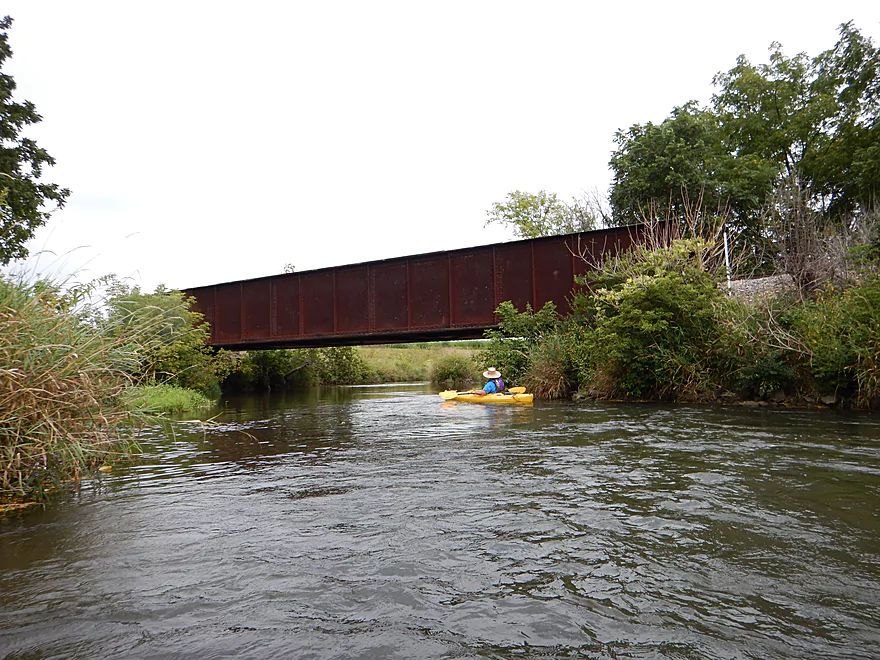 At the second railroad bridge there’s a log blocking the right channel completely, and good boat control is needed to sneak between the bridge pilings and woody debris on river left.