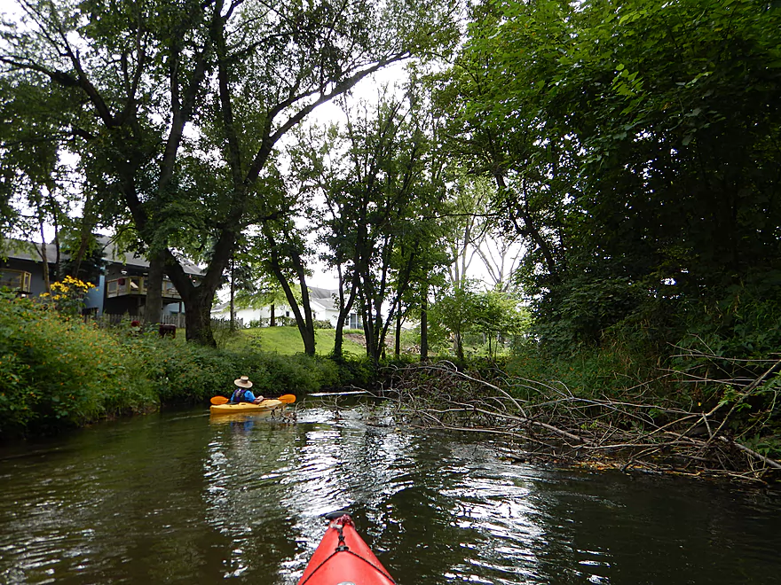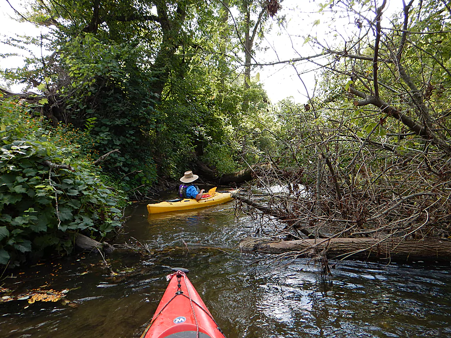 Boat control and short kayaks helped us navigate through some deadfall in the section through town. We sneaked through some tight spots, rammed over some logs, etc. At lower water levels, some portaging might be needed. Link to photo album: https://photos.app.goo.gl/t7CzBepamwoLQiTE6