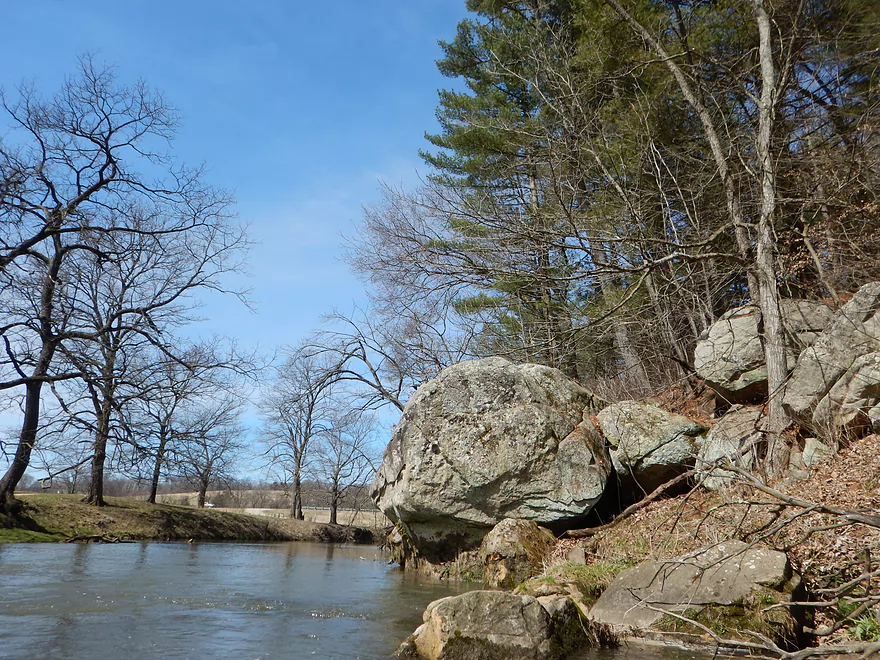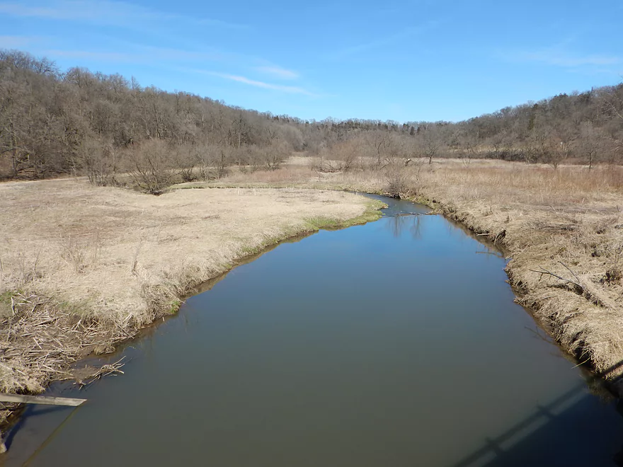 - Hwy Q5th → Witek Road: 7.3 miles. River flows through a massive hidden valley flanked by steep hillsides. Includes the western unit of Snow Bottom State Natural Area. While mostly open, the river does have three logjams that must be portaged. After Snow Bottom, the river loses most woods, gains a lot of mud, and flows through farm country.
