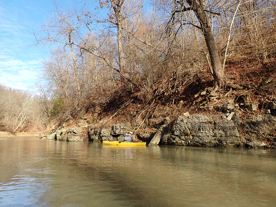 Middle Fork/South Fork Confluence to Hwy 61: 1.0 miles. Shallow rocky stretch mostly viable for paddling, but you may have to wait for high water. Likely no outcrops on this leg.Hwy 61/Mar Jo Quarry Road to Catfish Creek Launch: 1.5 miles. A good stretch with several rock outcrops. Current is slow which makes round-trips viable. Hwy 61 is not a viable access, but Mar Jo Quarry Road under it likely is a viable, but not great access (crossing over a railroad would be required). 99% of paddlers will (and should) do just round-trips from the main launch.