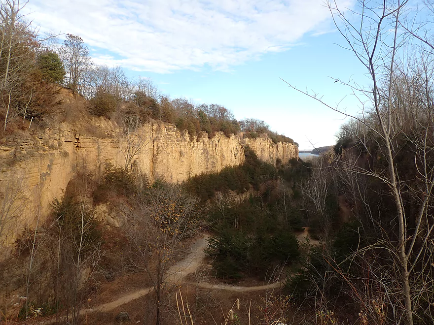Mines of Spain Recreation Area: This is a must-see park that includes Catfish Creek and a huge area to the south of the creek. It has a number of trails to explore, but the highlight is “Horseshoe Bluff Trail.” It’s a roughly 1-mile loop trail with the north portion going through an incredibly scenic canyon. At the northwest end of the canyon there is an overlook with a great view of the canyon’s interior plus parts of the Mississippi. What’s confusing is that the official trail map is somewhat inaccurate. It shows only one trail when in fact there are multiple trails through the canyon and at three different levels. I advise walking all of them (they aren’t that long). There is a fantastic hidden “level 2” trail that threads through cedars and skirts the edge of the northeast cliff that I highly recommend, but it’s not on the map. You will, however, see the stairs that lead up to it from inside the canyon. The official map also suggests the trail isn’t a complete loop (false) and you can’t access the overlook from inside the canyon (also false). Be warned that when the Mississippi is high, some of the park trails near the creek will not be accessible.