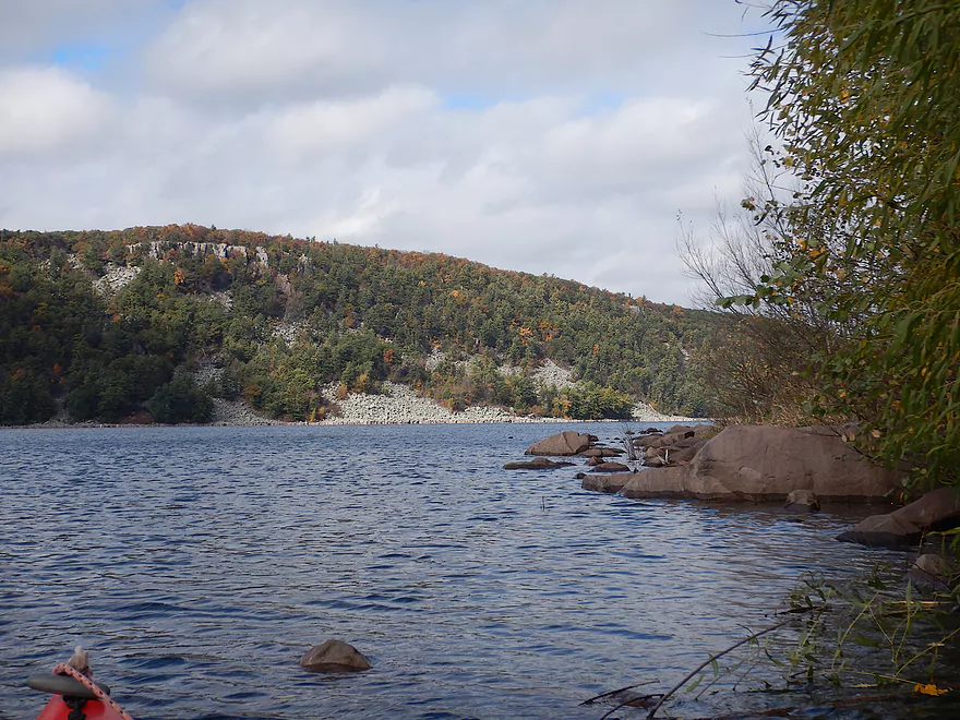 At the end of the East Bluff, I hit the South Shore where there is a popular beach and picnic area. Nearby is a trailhead for the East Bluff Trail and I could see the little people climbing on the rocks above from my kayak. To them, I must have really stood out in my red kayak virtually alone on the lake. Continuing on past more partially submerged picnic tables, I paddled past the Ice Age National Scenic Trail boardwalk which is traditionally one of the nicer and more secluded areas for swimming.