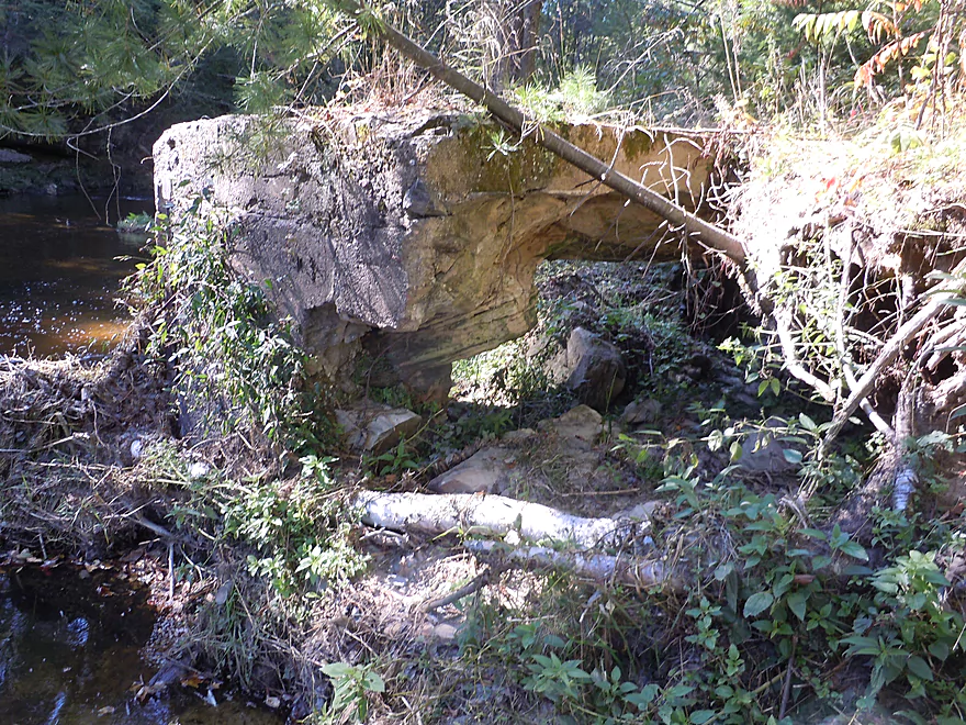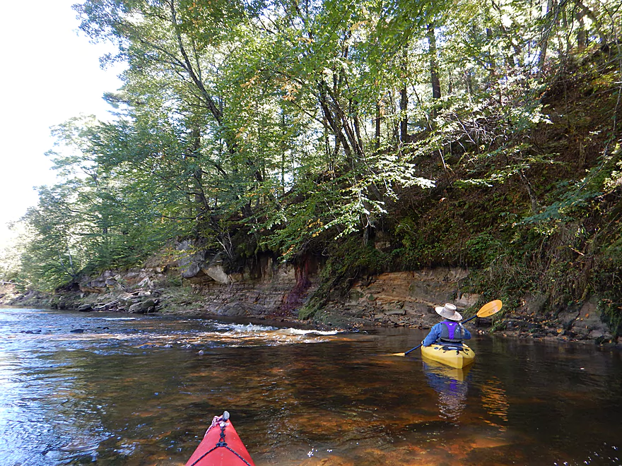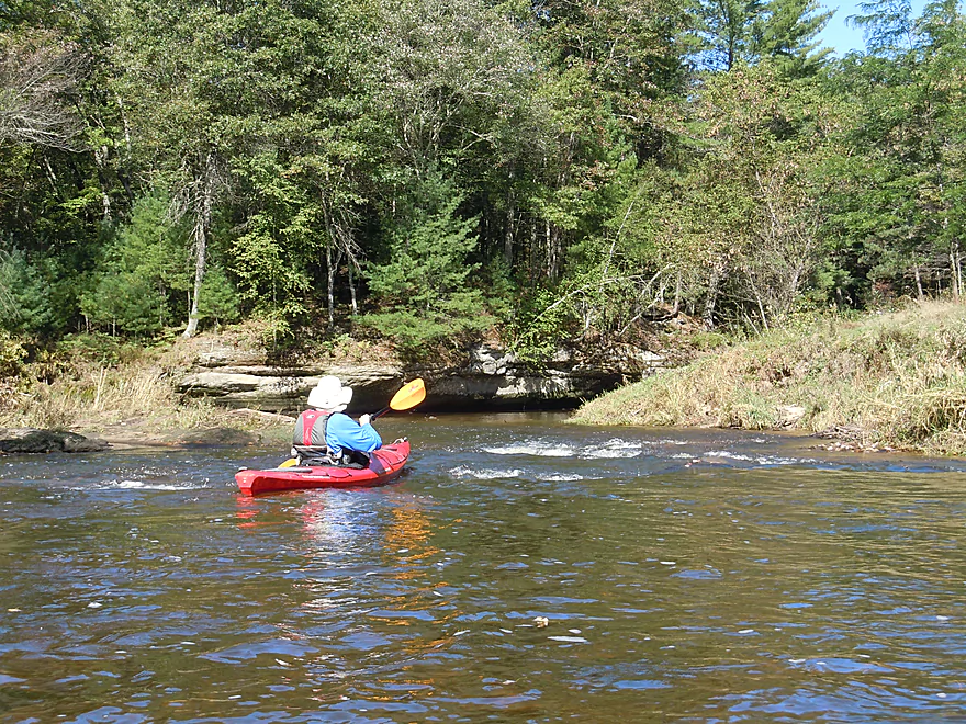 A cool side adventure on this trip, but easy to miss, will be Wrightsville Creek, a small brook that comes in from the right (maybe a half mile after putting in). It’s worth it to get out at the sandy mouth and wade upstream as far as you can. The water is clear as can be and runs over smooth, flat rock. As you wade up, you’ll see a spectacular rock bend that the creek flows under, then a double waterfall with an attractive pool between the two falls and sandstone walls on either side. See photos.