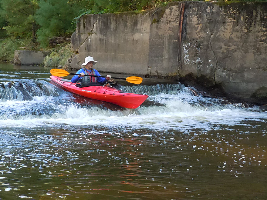- The first noteworthy drop is a partly removed dam which you can run over a small ramp on the left. This is easy to scout from shore. Because of the old dam foundations on shore, it would be difficult to portage. Do not miss the chute/ramp though as there is exposed rebar everywhere else on the dam. Video reference at 2:38.