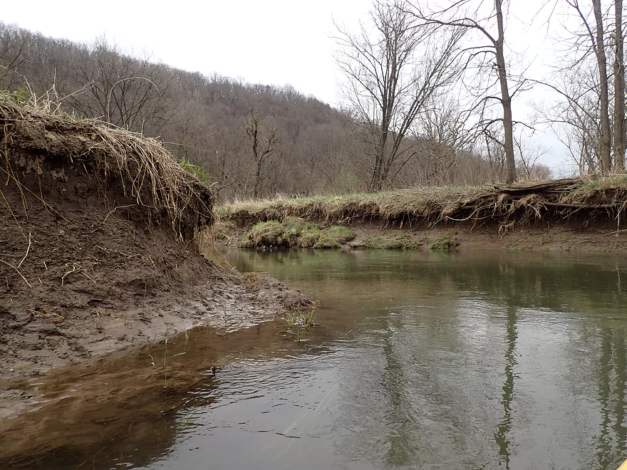 Past Hwy F, the creek started to open up with far fewer trees. This was a nicer stretch but the banks were still heavily eroded. I paddled past a farm which featured a large pasture with cows grazing along the banks. Part of the reason the creek has so much topsoil erosion is the watershed resides between steep hillsides which drain fast after a rain. But the other problem is farmers let their cows graze right up to the creek. Rivers and creeks need protective bank buffers from agriculture and development. When cows are allowed into a creek, they trample and eat key plants needed to stabilize the creek. Lacking structural integrity, the banks will “bleed” mud which will accrue as downstream mud banks.