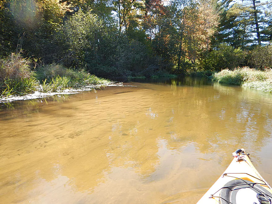 After the dam, the creek matures into a river. Not necessarily a good thing though. With the larger size, the clarity was not as nice nor were the banks as scenic. Still some nice spots, but the scenery was mostly messy hardwoods, a large dike and a golf course. What was strange here was how wide the river was for it being so far upstream. In fact it seemed wider than the sections below Sparta, which I verified from satellite images (not normal).