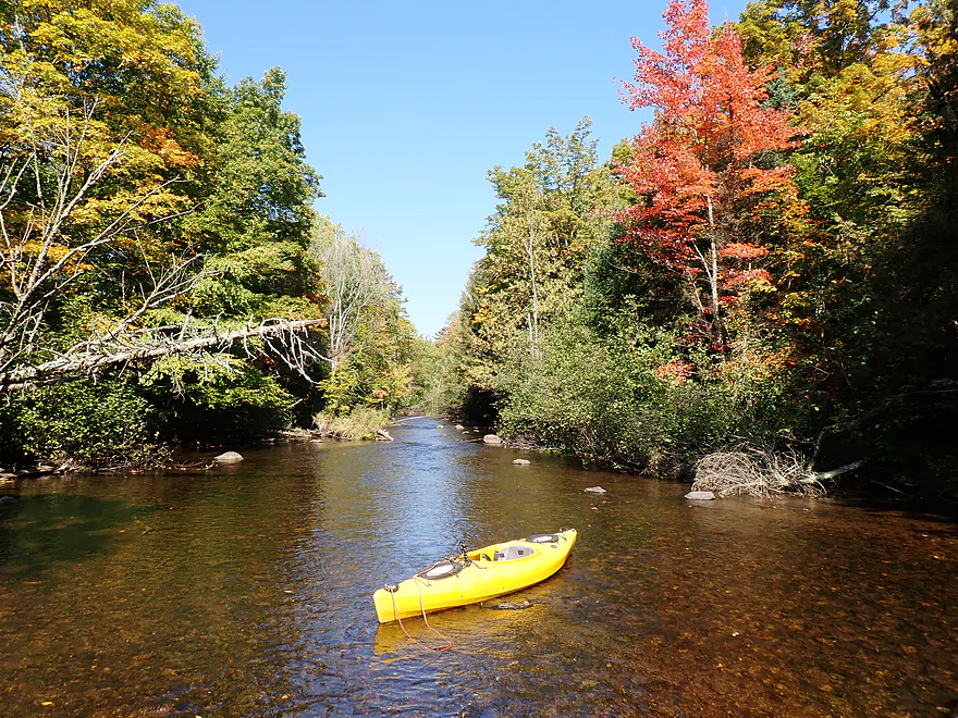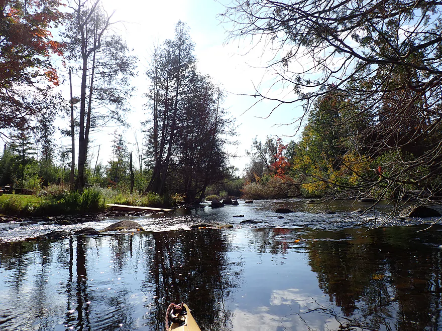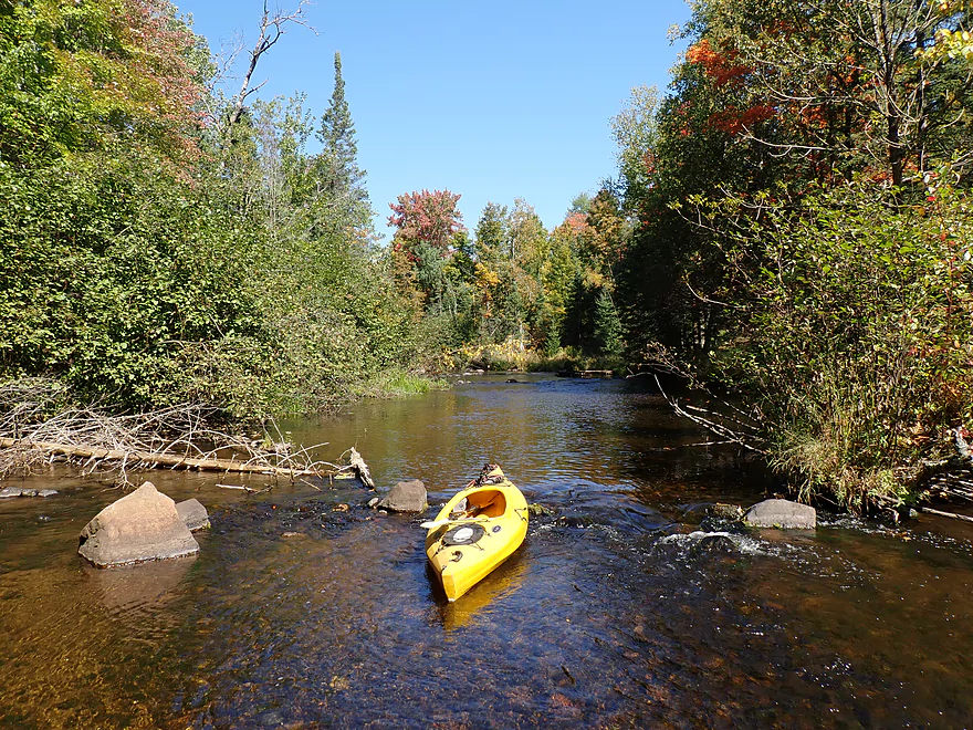 The next mile was my favorite part of the trip, with terrific up-north creek scenery. Often I got out of my boat, not for logjams or shallow water, but to take photos of the attractive fall color, pine-lined banks and small boulder gardens. The locals love building these cute little rock dams on the river and most weren’t difficult to scoot over.