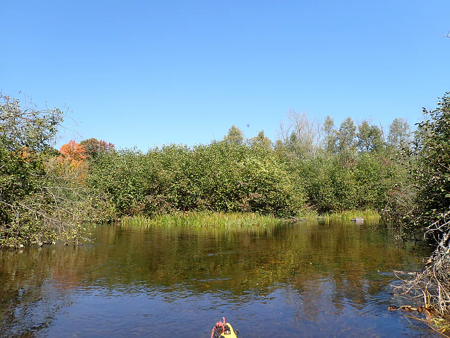 I launched from the Hwy A bridge, which had a steep bank but was an otherwise ok bridge access and was scenic. Here the “river” was small (perhaps a bit too), but featured attractive woods with a mix of conifers and some white cedar. The first mile of the trip (before the East Branch confluence) proved to be a disappointment. The rocky channel was at times too shallow and downed trees were common. I lost count of the number of times I had to get out of my boat. On the plus side the channel was often rocky and shallow which made wading over the obstructions fairly easy (with a few tricky exceptions).