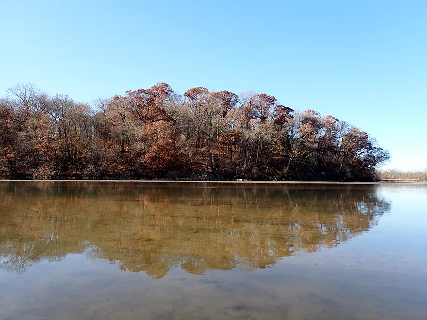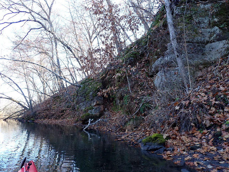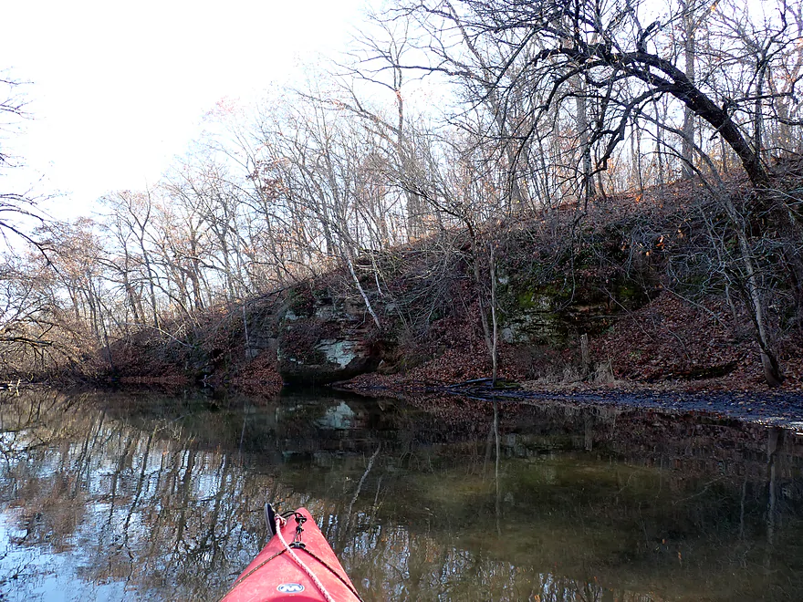 I finally paddled to the mouth and onto the Sugar River (big version). The Sugar here has been impounded by a downstream dam, which left a delta of small muddy islands, little current, and a very silted-in lake. It was significantly less interesting than the Little Sugar River. That being said, Albany Lake wasn’t awful as there were attractive wooded bluffs on both sides of the river and still some late fall color.