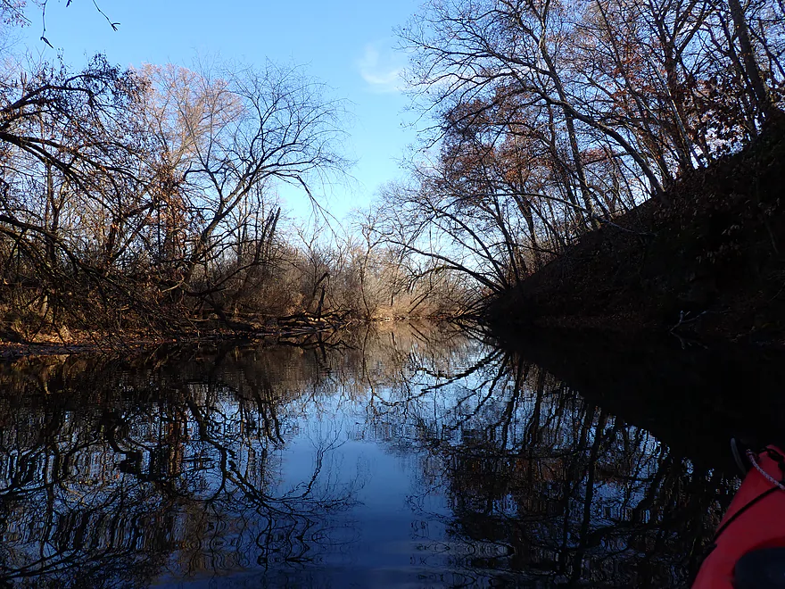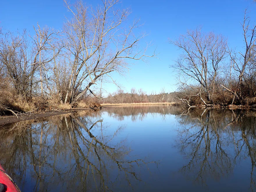 Much of this trip flowed through the Albany Wildlife Area, which is a surprisingly attractive wetland. The river itself twists sharply past glacial hills and wooded banks filled with oaks (still with some late fall color). Bare trees created attractive skeleton silhouette reflections atop the water.