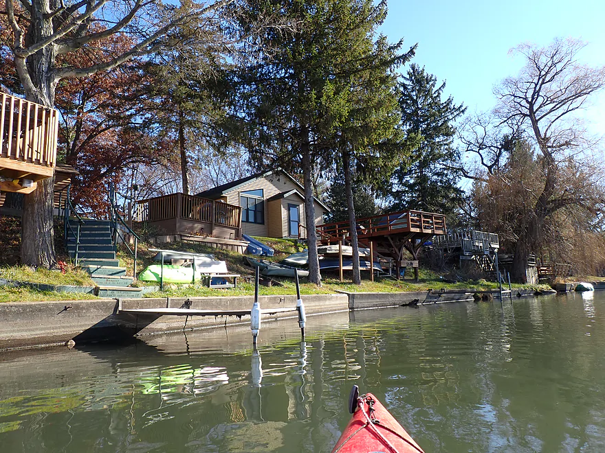 As I continued downstream, I encountered the outskirts of Albany and a series of small cottages. These were nicer than the typical riverside homes you see today. Modern waterfront properties tend to be located on oversized and overly-flattened lots, have huge McMansions, and are mostly clearcut to make way for large eco-desert lawns. But here the cottages and lots were very small, quaint, and built into the hillsides and woods. A number of homes had small boathouses, but I doubt these were usable as Albany Lake was (mostly) too silted in for motorboats.