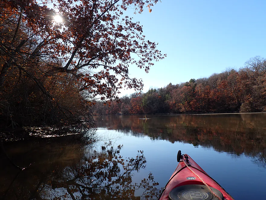 This trip was done in late November when the water temperature was cold (44 degrees Fahrenheit per the Verona gauge). As a general rule, paddlers should not be kayaking when the air temperature + water temperature is less than 120 degrees. If you do, you should wear protective clothing which can be found at most outdoor shops. I think you can cheat the 120 degree rule a bit if there is: safe, slow current, no logjams, no waves, you stay close to shore, and the river isn’t very wide or deep. It should be noted most fishermen in motorboats don’t obey the 120 degree rule (which I saw a few on the Sugar River).