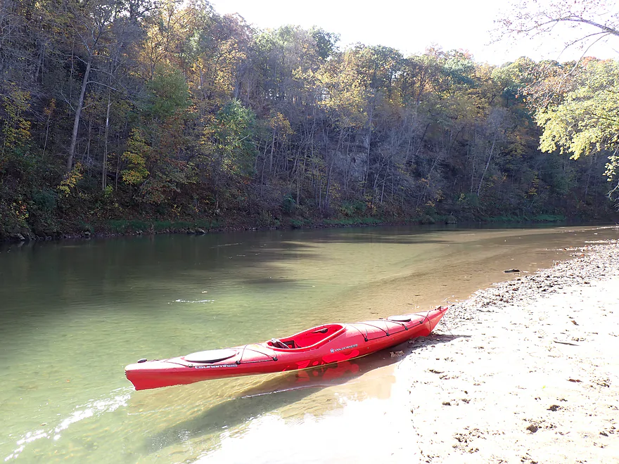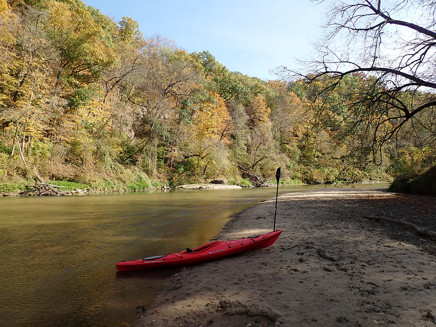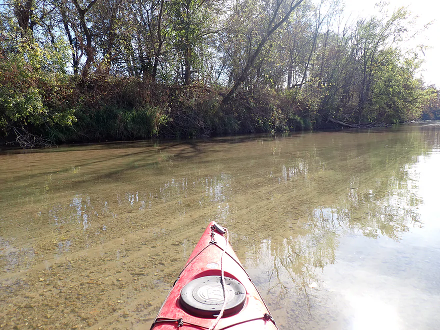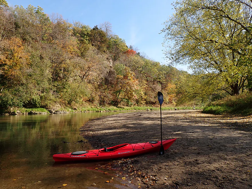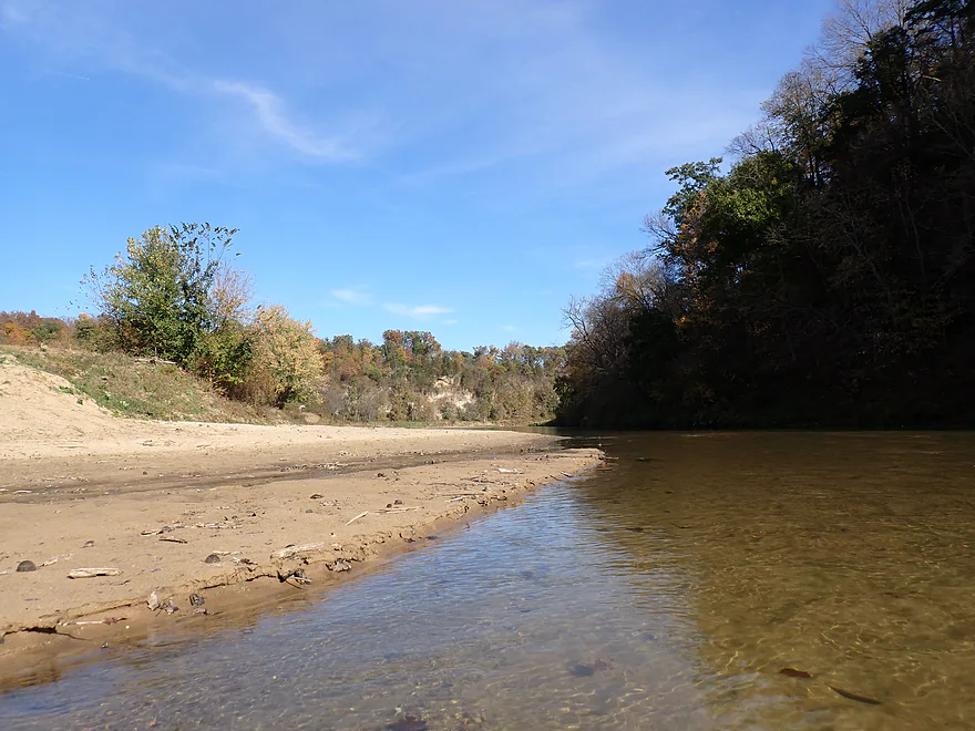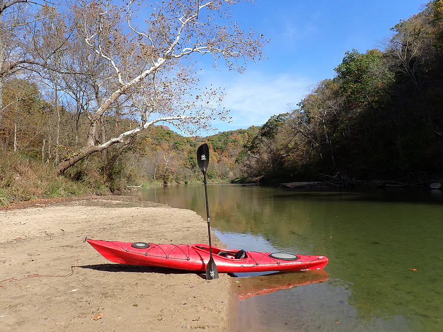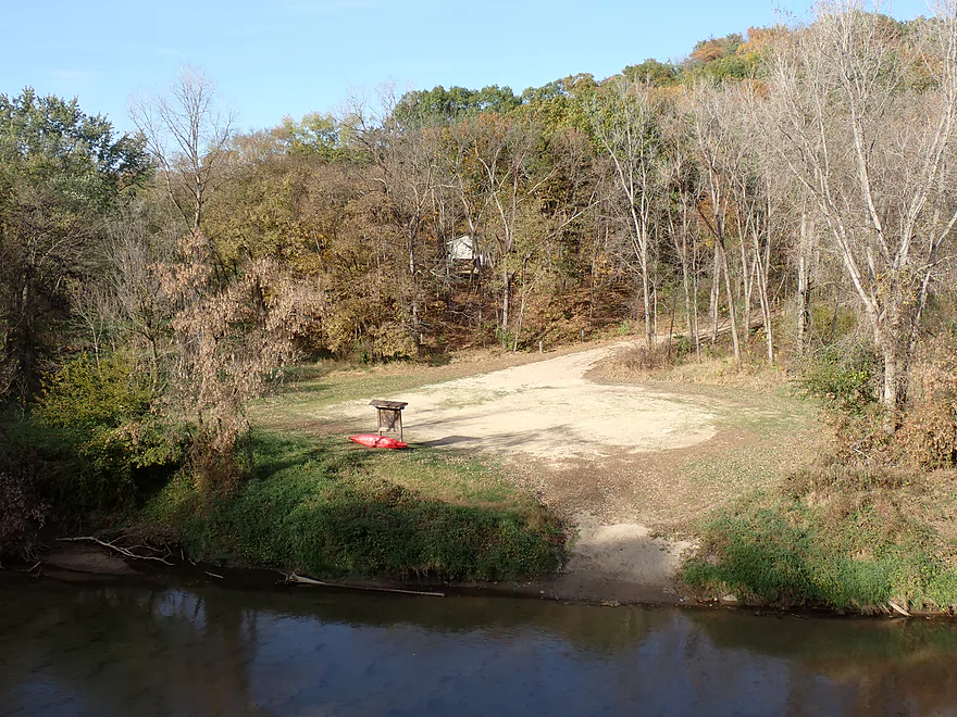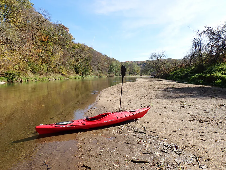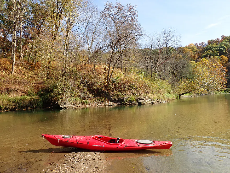 - Schram Park Access to Pin Oak Access: 2.6 miles. Includes some shallow but fun riffles. Per paddling author Nate Hoogeveen, some stretches have exposed bedrock.