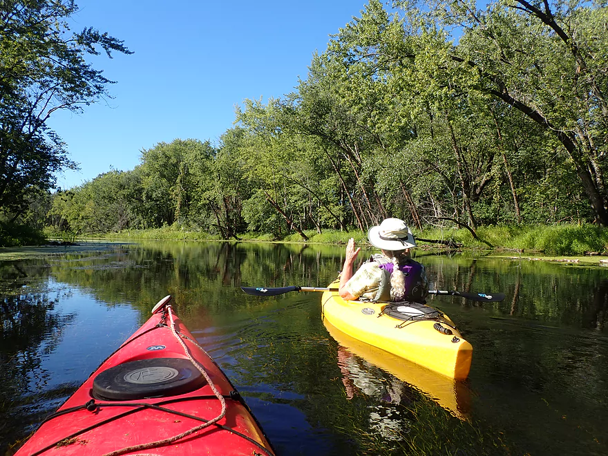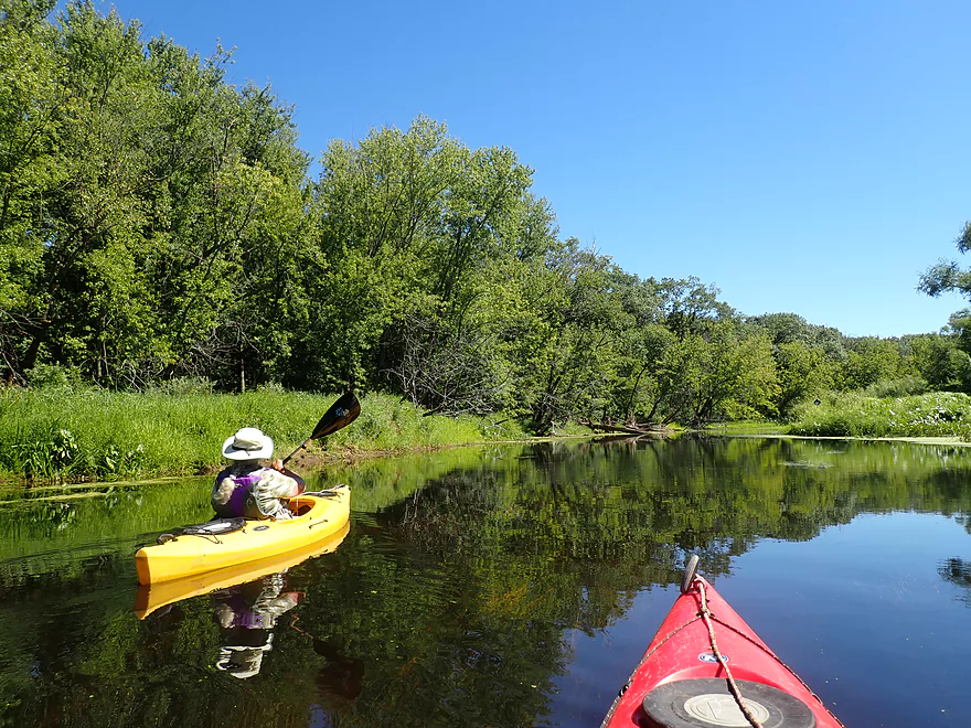 Reno Bottoms Trail: 3-14 miles. Put in on the Minnesota side and float down a long slough. Many intermediate take-out options. Access at Reno/Hwy 26 and New Albin. Some of the launches can be under water during high depths.
