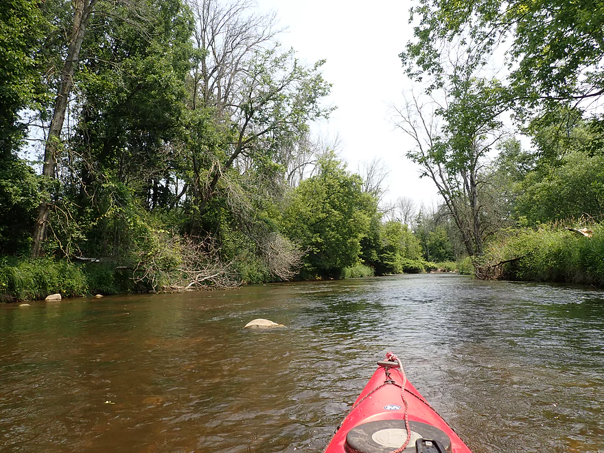 - Hwy C/J to Hwy J: 0.5 miles. Wooded, narrow, fast current, some obstacles and logjams, but very scenic.