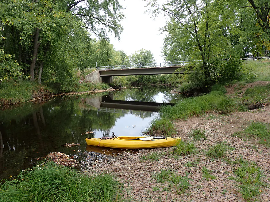- County Road W to Mouth: 0.3 miles. A short, shallow stretch with a few islands and a railroad bridge.