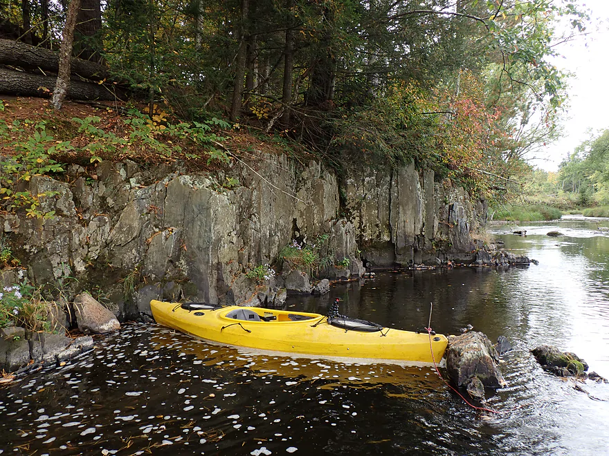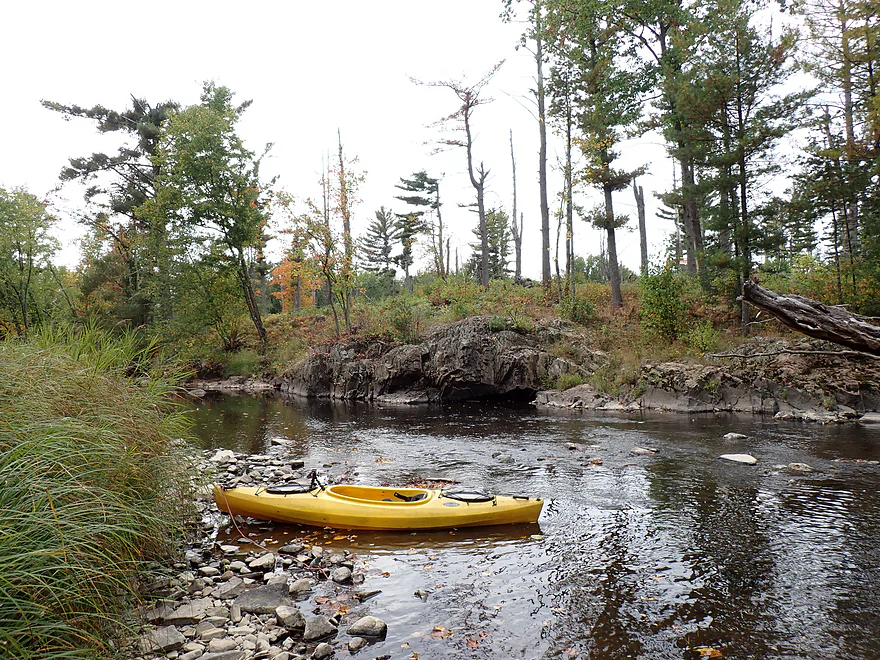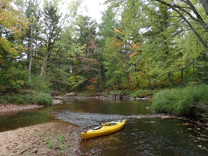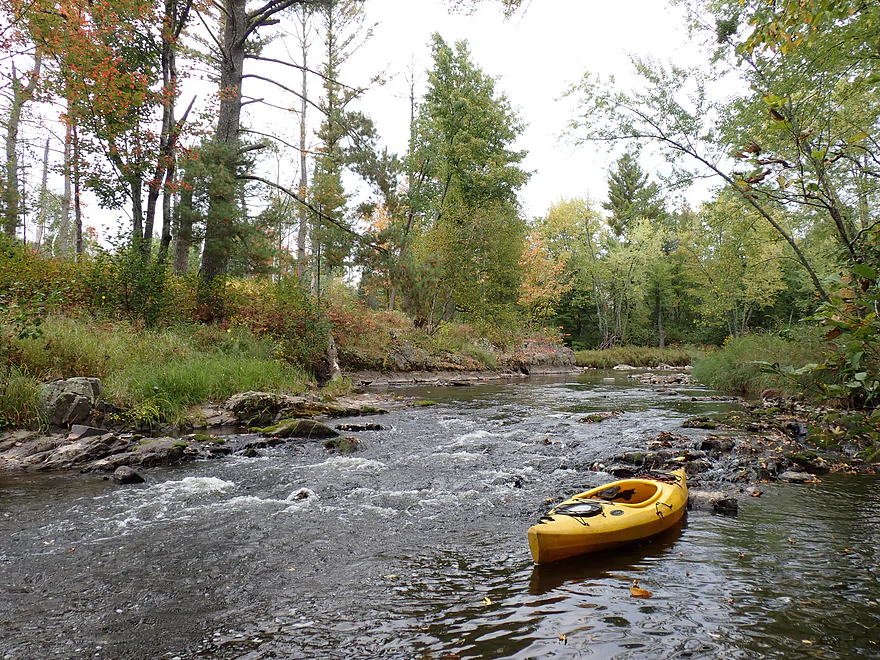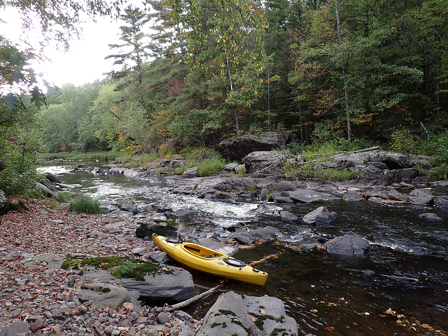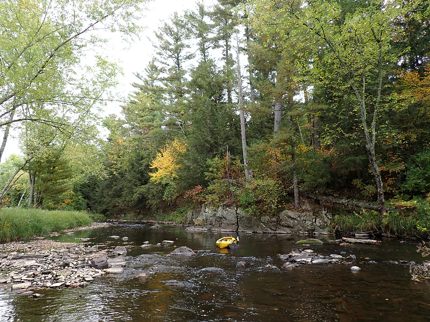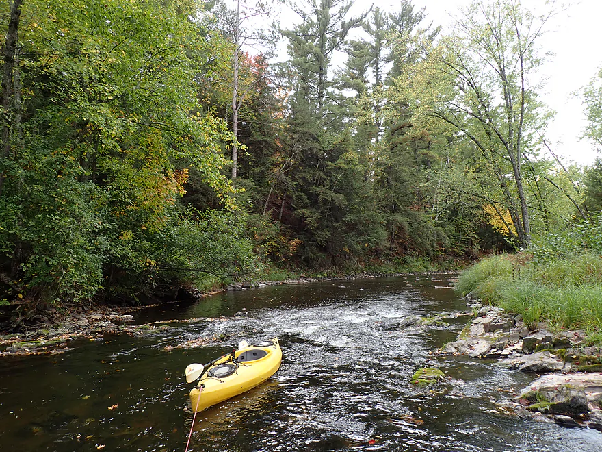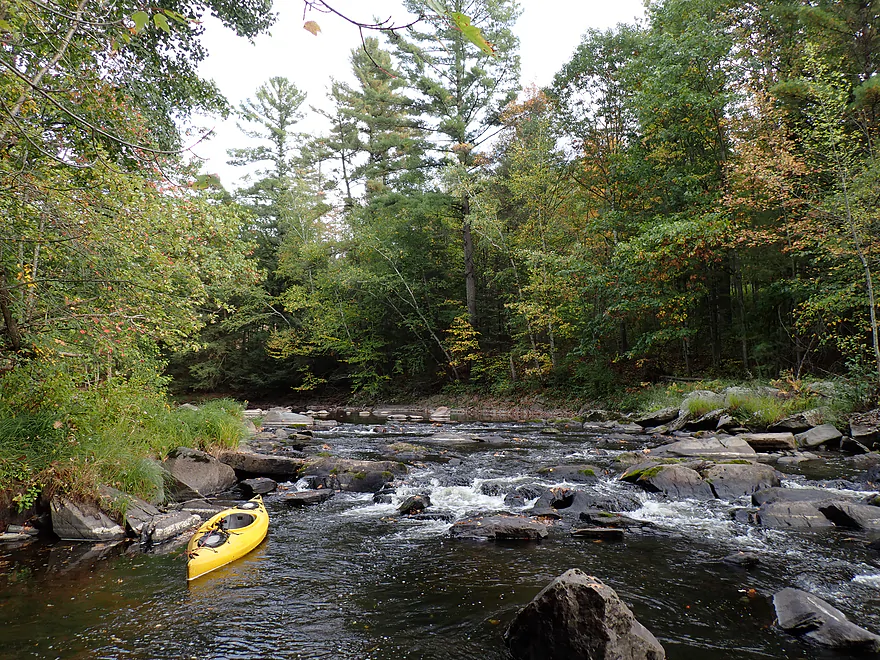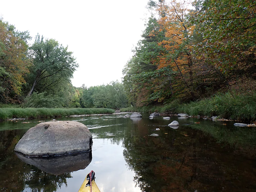 - Pine River Park to County Road W: 2.4 miles. The most popular stretch on the river. Highlights include extraordinary scenery, woods, boulder gardens, and the “Pine Dells” (a half-mile long granite gorge). Frequent rapids make this difficult to time, as it is often too shallow or too strong. There are two Class 3’s that need to be navigated carefully.