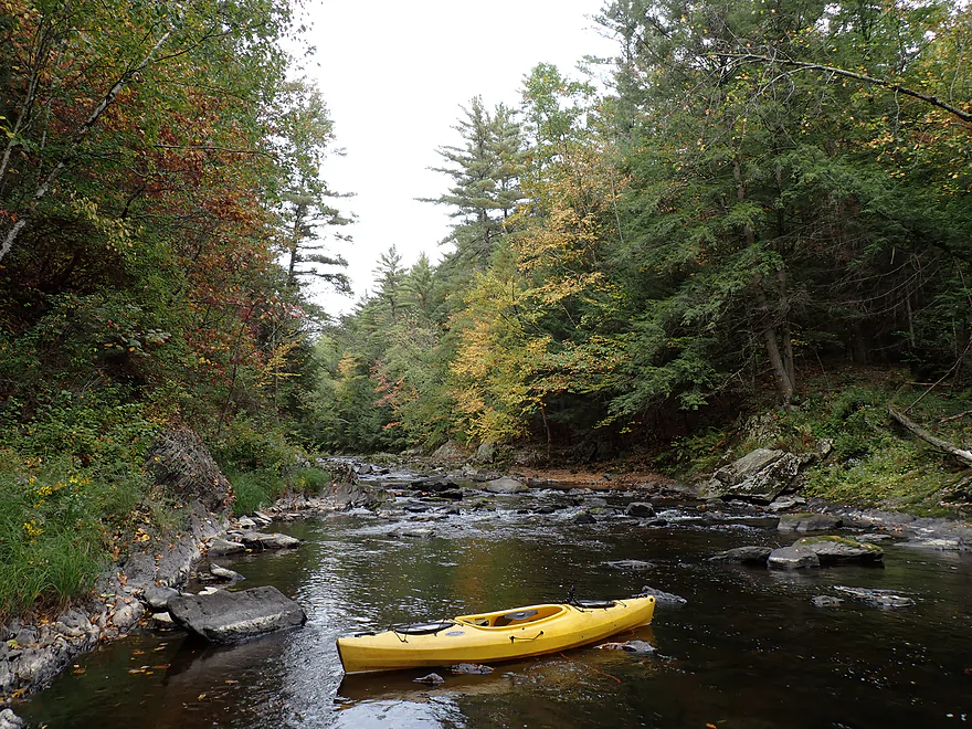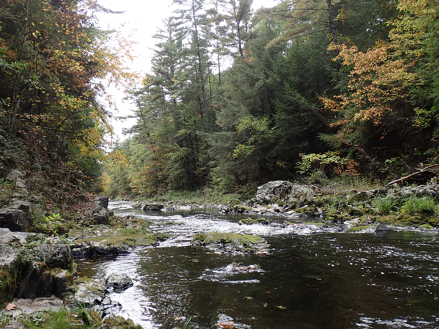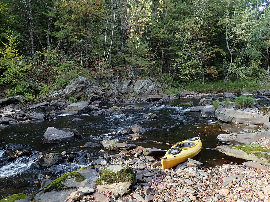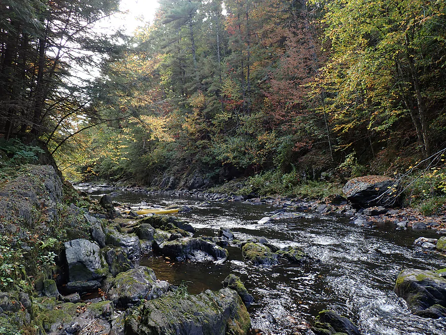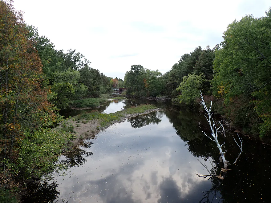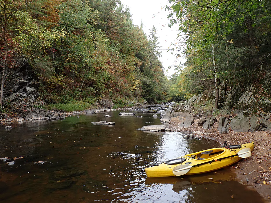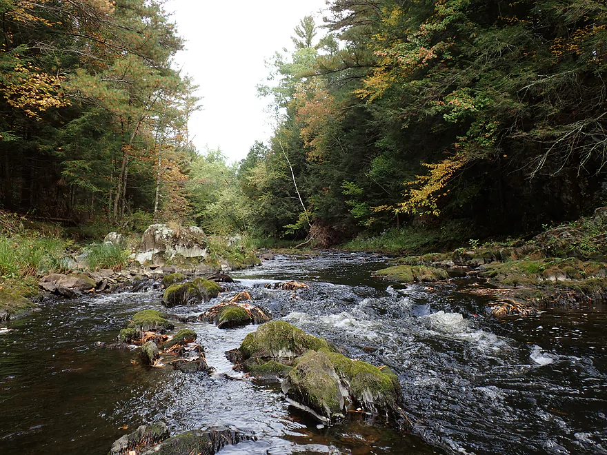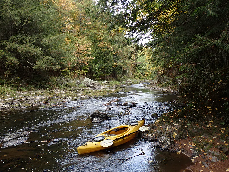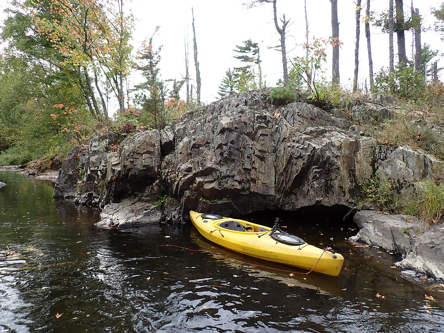 - Pine River Park to County Road W: 2.4 miles. The most popular stretch on the river. Highlights include extraordinary scenery, woods, boulder gardens, and the “Pine Dells” (a half-mile long granite gorge). Frequent rapids make this difficult to time, as it is often too shallow or too strong. There are two Class 3’s that need to be navigated carefully.