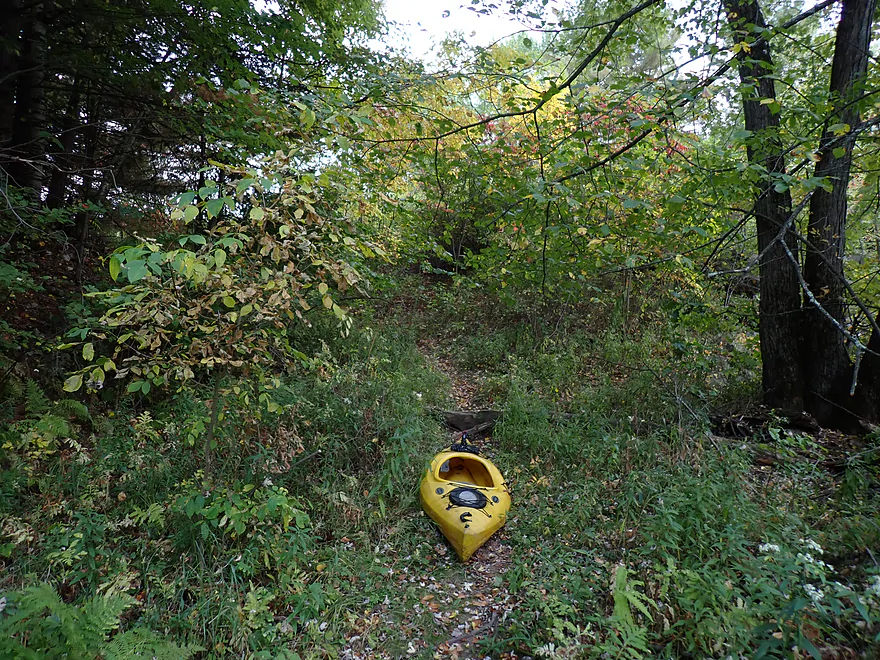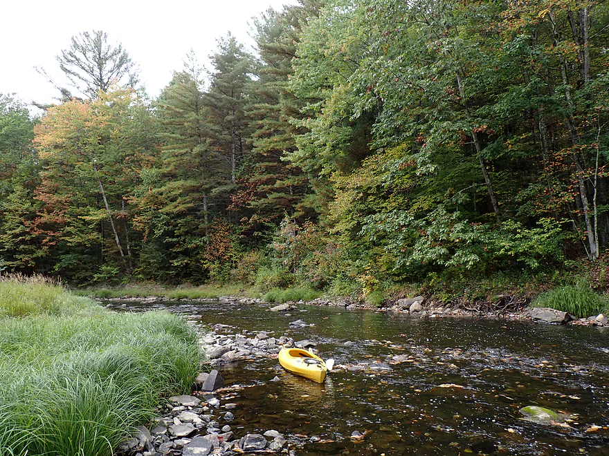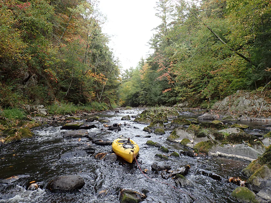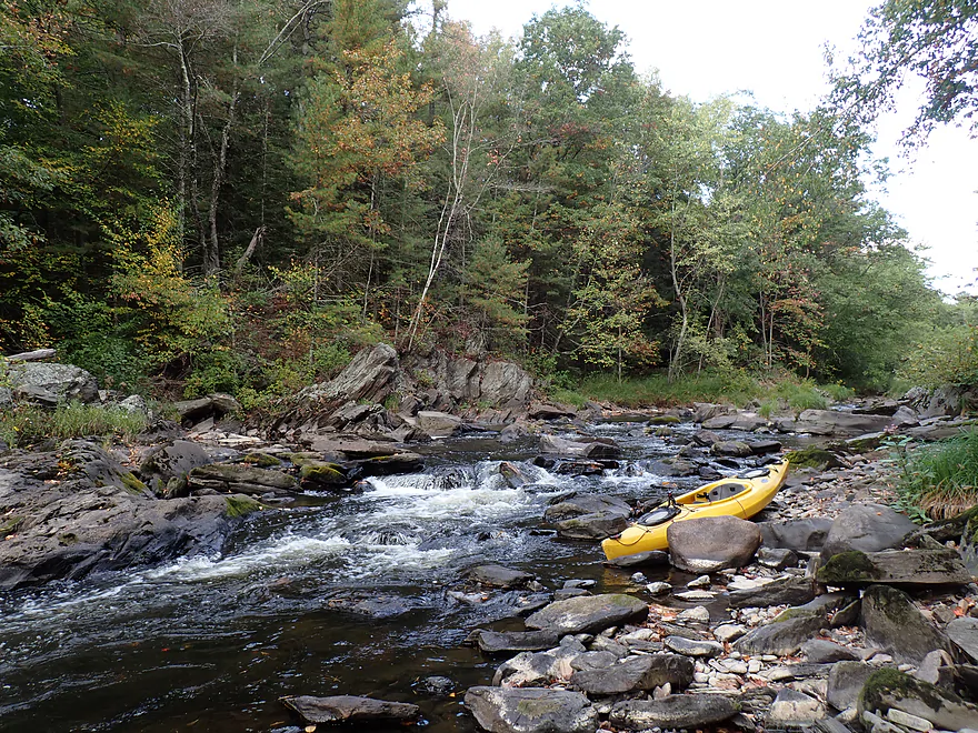 There is one spot I dub “Double Dells” which I considered a Class 3. Here a rock island splits the river in two. The left/east channel flows into boulders, forcing an awkward redirect back to the right. American Whitewater warns of a hole in the gorge, and I think this is the spot. You can paddle right of the rock island, but that too is a bit difficult, as there is an awkward descent down irregularly placed boulders. This is marked on the map and referenced in the video at 3:06.