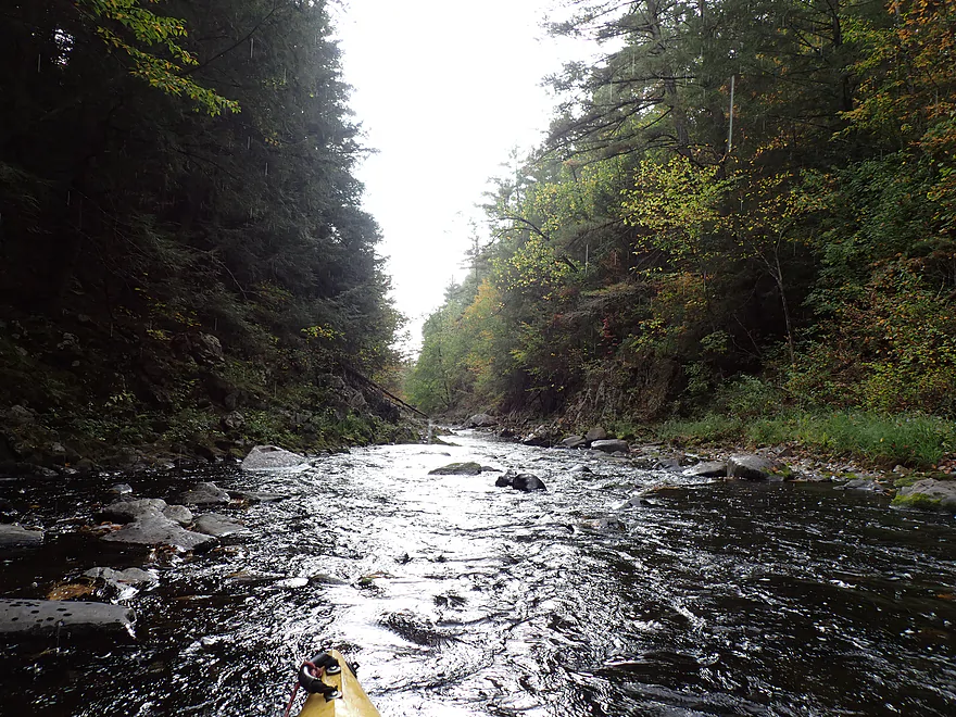 It started to rain at this point, and unless I was imagining things I actually thought the river started to rise a bit while I was paddling it. The gorge got progressively faster, rougher, and more scenic the further down I went. Near the end I encountered what I’ll dub “Double Dells Rapids” (Class 3). Here a rock island split the river in two (sort of creating two dells).