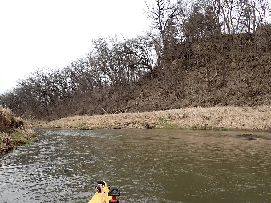 I started at Coon Hollow Road which was a pleasant and scenic bridge access. Just downstream from the bridge are inviting rapids and an attractive limestone outcrop. The limestone would continue off and on for the next half mile along the east bank. While scenic, I wasn’t in a great mood to appreciate it because the weather was windier, colder, more overcast, and clammier than expected. I was also bummed to see how muddy and degraded the banks were. Like many Grant County rivers and streams, cattle are allowed free access into the Platte where they trample/eat plants that would otherwise stabilize the river banks.