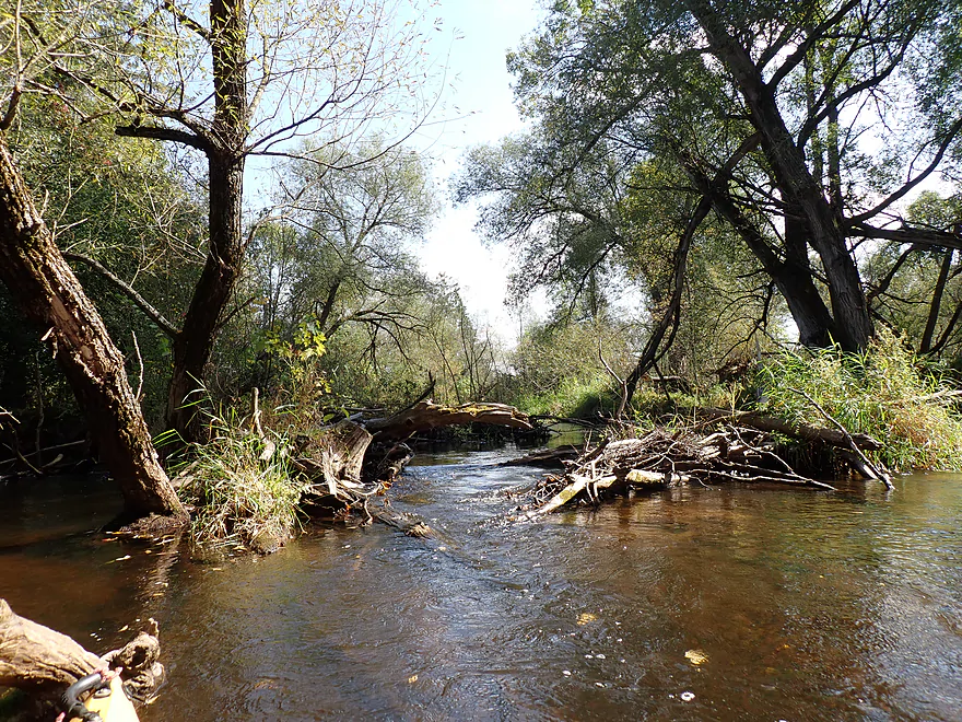 - Prairie Forks Drive to Axen Road: 0.8 miles. River meanders through scrubby woods with maybe two logjams.