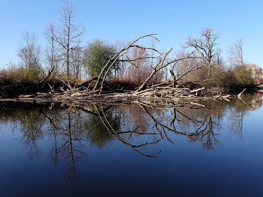 - Hillcrest Drive to Riveredge Park: 0.9 miles. Scenic stretch through the outskirts of Allenton with good clarity. However, there are two major logjams to portage and several minor logjams to squeak past.