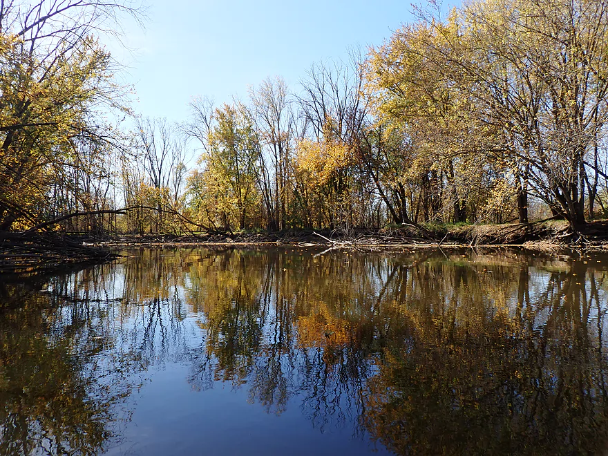 - Riveredge Park to Hwy DW: 2.7 miles. An open stretch through wetgrass and a state natural area. One logjam needs to be portaged.