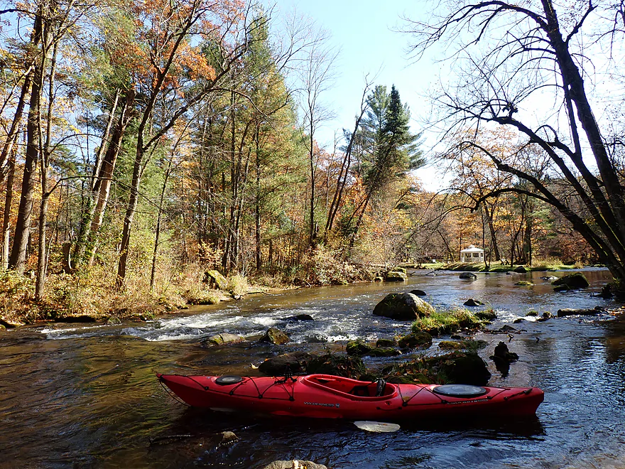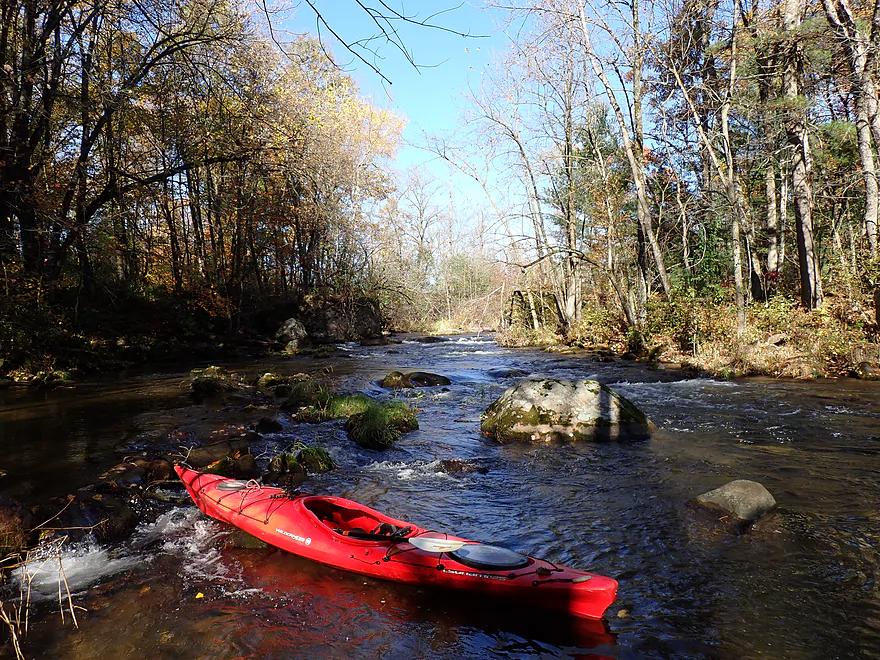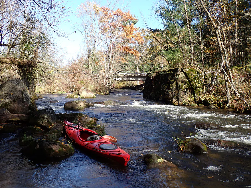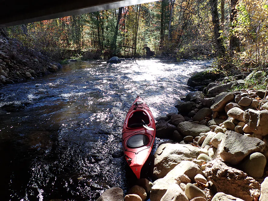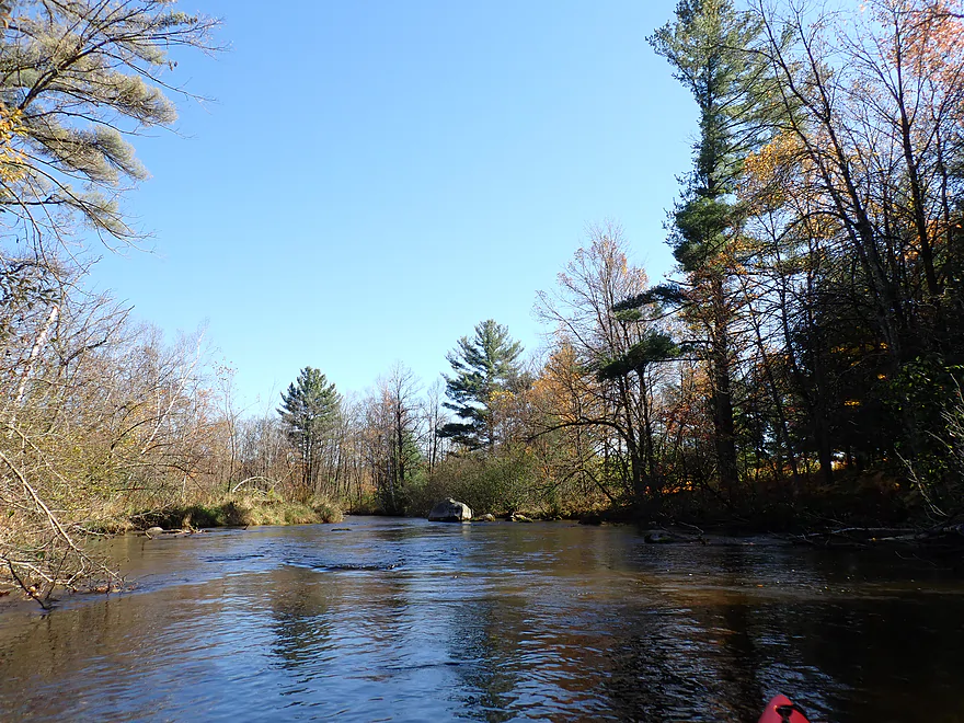 - Amherst Dam to Buchholz Road: 5.7 miles. This section was great fun because of its many rapids, clear water, narrow channel, boulder gardens and wooded banks.