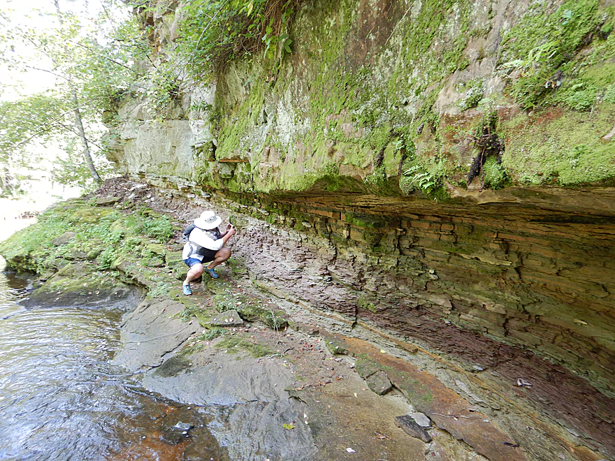Following the scenic granite outcrops below the dam and the Hwy B bridge, the creek quickly descends over a series of rapids (which were quite bumpy). After a tall suspension foot bridge (and portage of a tricky logjam/rapids combo), the creek slows and widens. Under the Hwy 10 bridge you’ll see the first of 14-15 sandstone outcrops. For the most part, these weren’t too big and weren’t in the same league as Halls Creek (Wedges’ uber elite neighbor 5 miles to the south), but still they were a neat experience. The nicest and largest outcrop appears roughly halfway into the trip. Here you’ll paddle over some light rapids which funnel paddlers directly beside and then around a sheer sandstone wall. A very cool “calendar shot moment” and highly reminiscent of Halls Creek. At the base was a pink dolomite layer, some fantastic rock layering, and in the debris field there appeared to be some sandstone with ancient fossil imprints.